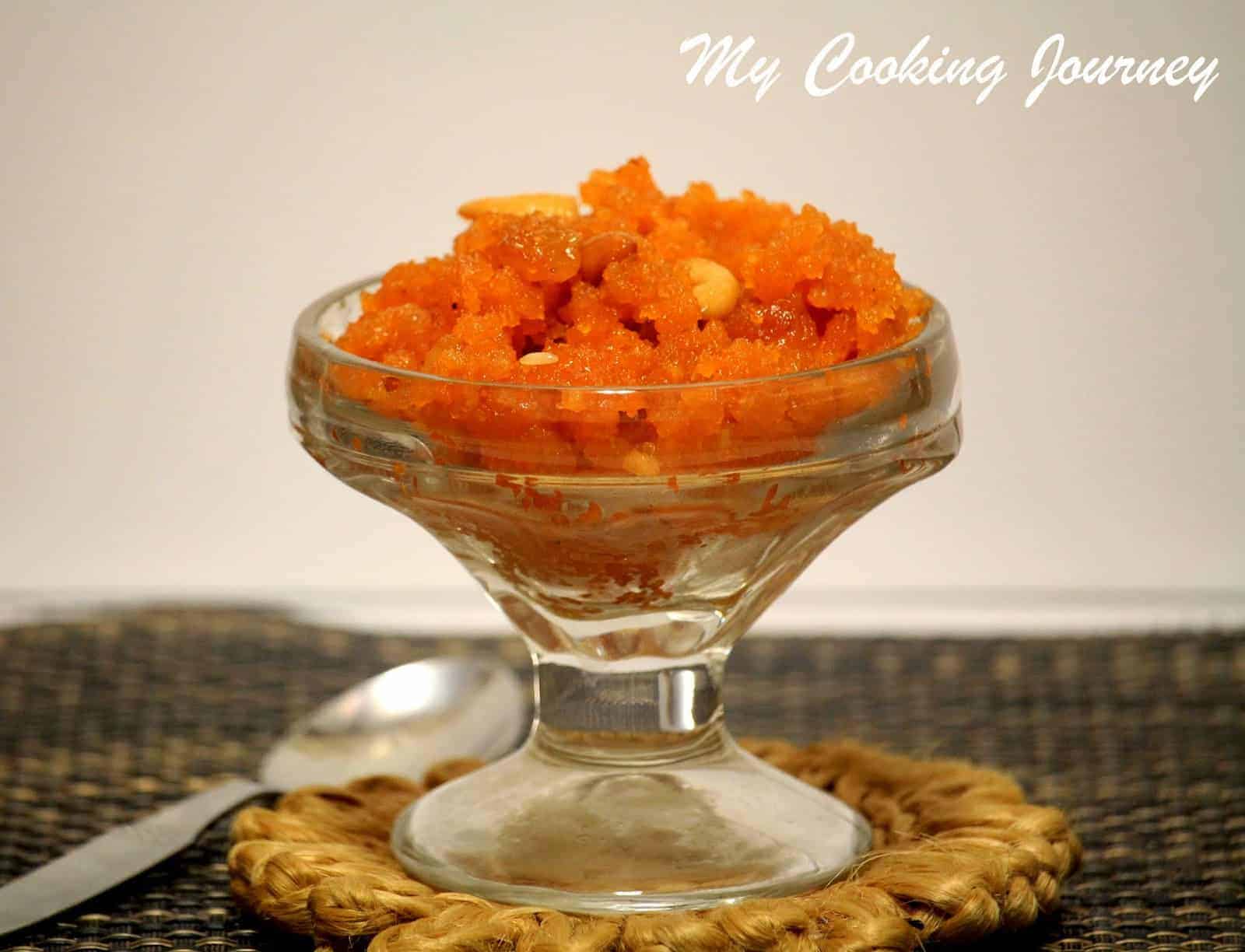 - In a small pan, heat the remaining 1 tablespoon of ghee and fry the cashews, raisins, and cardamom powder. Add it to the Kesari and mix.