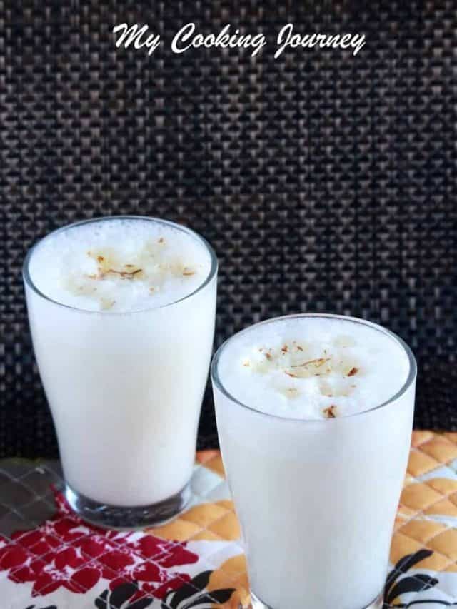 This lassi recipe has saffron in it, which just made it very flavorful. Also, adding some hot boiled milk to the lassi when churning gives it a lot of creaminess. You can make this using your hand blender (which is what I used) or in the regular blender.
